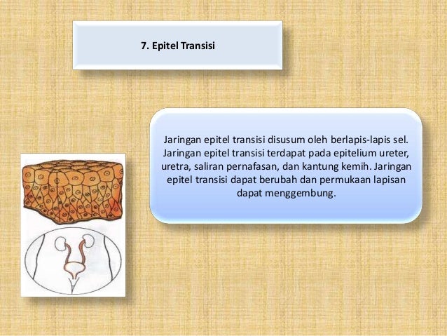 - 9. 7. Epitel Transisi Jaringan epitel transisi disusum oleh berlapis-lapis sel. Jaringan epitel transisi terdapat pada epitelium ureter, uretra, saliran pernafasan, dan kantung kemih. Jaringan epitel transisi dapat berubah dan permukaan lapisan dapat menggembung.
