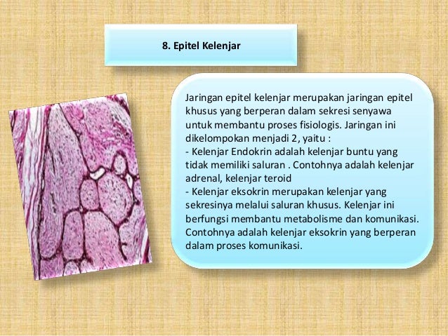 - 10. 8. Epitel Kelenjar Jaringan epitel kelenjar merupakan jaringan epitel khusus yang berperan dalam sekresi senyawa untuk membantu proses fisiologis. Jaringan ini dikelompokan menjadi 2, yaitu : - Kelenjar Endokrin adalah kelenjar buntu yang tidak memiliki saluran . Contohnya adalah kelenjar adrenal, kelenjar teroid - Kelenjar eksokrin merupakan kelenjar yang sekresinya melalui saluran khusus. Kelenjar ini berfungsi membantu metabolisme dan komunikasi. Contohnya adalah kelenjar eksokrin yang berperan dalam proses komunikasi.