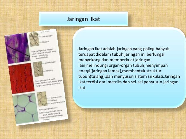 - 11. Jaringan Ikat Jaringan ikat adalah jaringan yang paling banyak terdapat didalam tubuh.jaringan ini berfungsi menyokong dan memperkuat jaringan lain,melindungi organ-organ tubuh,menyimpan energi(jaringan lemak),membentuk struktur tubuh(tulang),dan menyusun sistem sirkulasi.Jaringan ikat terdisi dari matriks dan sel-sel penyusun jaringan ikat.