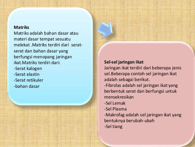- 12. Matriks Matriks adalah bahan dasar atau materi dasar tempat sesuatu melekat .Matriks terdiri dari serat- serat dan bahan dasar yang berfungsi menopang jaringan ikat.Matriks terdiri dari: -Serat kalogen -Serat elastin -Serat retikuler -bahan dasar Sel-sel jaringan Ikat Jaringan ikat terdiri dari beberapa jenis sel.Beberapa contoh sel jaringan ikat adalah sebagai berikut. -Fibrolas adalah sel jaringan ikat yang berbentuk serat dan berfungsi untuk mensekresikan -Sel Lemak -Sel Plasma -Makrofag adalah sel jaringan ikat yang bentuknya berubah-ubah -Sel tiang