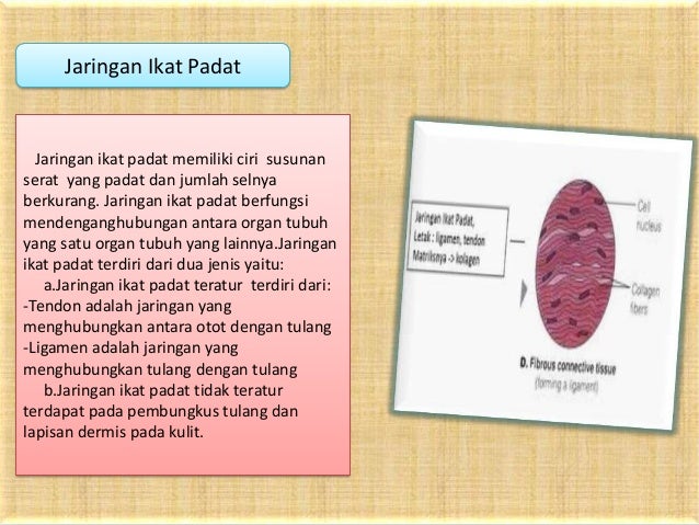 - 14. Jaringan Ikat Padat Jaringan ikat padat memiliki ciri susunan serat yang padat dan jumlah selnya berkurang. Jaringan ikat padat berfungsi mendenganghubungan antara organ tubuh yang satu organ tubuh yang lainnya.Jaringan ikat padat terdiri dari dua jenis yaitu: a.Jaringan ikat padat teratur terdiri dari: -Tendon adalah jaringan yang menghubungkan antara otot dengan tulang -Ligamen adalah jaringan yang menghubungkan tulang dengan tulang b.Jaringan ikat padat tidak teratur terdapat pada pembungkus tulang dan lapisan dermis pada kulit.