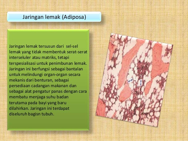 - 15. Jaringan lemak (Adiposa) Jaringan lemak tersusun dari sel-sel lemak yang tidak membentuk serat-serat interseluler atau matriks, tetapi terspesialisasi untuk penimbunan lemak. Jaringan ini berfungsi sebagai bantalan untuk melindungi organ-organ secara mekanis dari benturan, sebagai persediaan cadangan makanan dan sebagai alat pengatur panas dengan cara membatu menjaga suhu badan terutama pada bayi yang baru dilahirkan. Jaringan ini terdapat diseluruh bagisn tubuh.