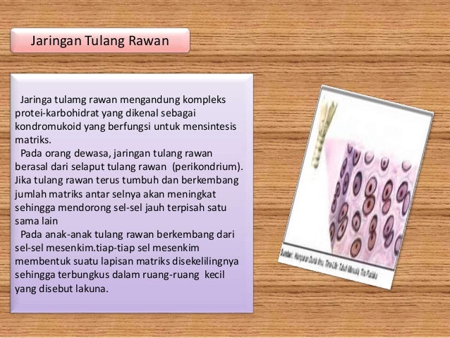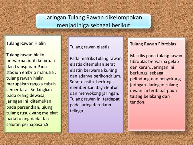 - 17. Jaringan Tulang Rawan dikelompokan menjadi tiga sebagai berikut Tulang Rawan Hialin Tulang rawan hialin berwarna putih kebiruan dan transparan.Pada stadiun embrio manusia , tulang rawan hialin merupakan rangka tubuh sementara . Sedangkan pada orang dewasa, jaringan ini ditemukan pada persendian, ujung tulang rusuk yang melekat pada tulang dada dan saluran pernapasan.S Tulang rawan elastis Pada matriks tulang rawan elastis ditemukan serat elastin berwarna kuning dan adanya perikondrium. Serat elastin berfungsi memberikan daya lentur dan menyokong jaringan. Tulang rawan ini terdapat pada laring dan daun telinga. Tulang Rawan Fibroblas Matriks pada tulang rawan fibroblas berwarna gelap dan keruh. Jaringan ini berfungsi sebagai pelindung dan penyokong jaringan. Jaringan tulang rawan ini terdapat pada tulang belakang dan tendon.
