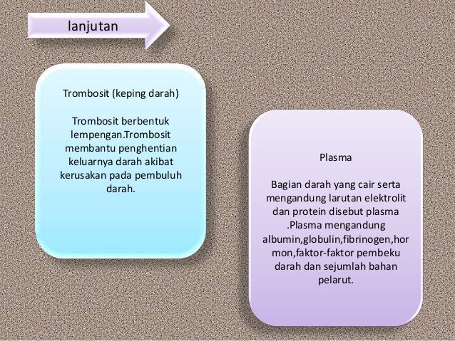- 21. lanjutan Trombosit (keping darah) Trombosit berbentuk lempengan.Trombosit membantu penghentian keluarnya darah akibat kerusakan pada pembuluh darah. Plasma Bagian darah yang cair serta mengandung larutan elektrolit dan protein disebut plasma .Plasma mengandung albumin,globulin,fibrinogen,hor mon,faktor-faktor pembeku darah dan sejumlah bahan pelarut.