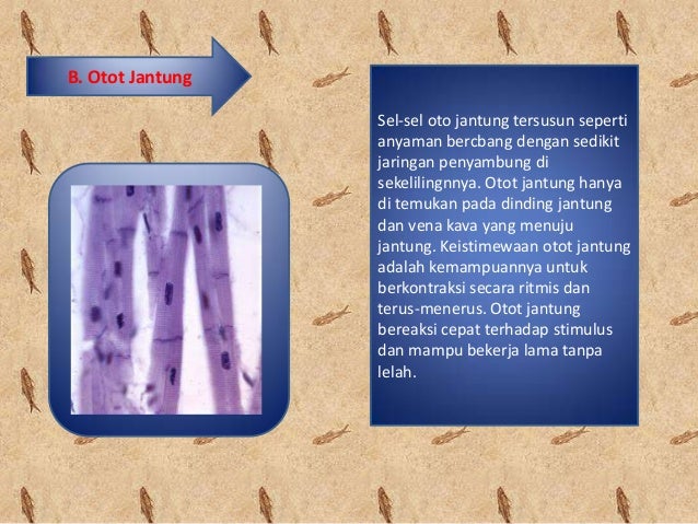 - 25. B. Otot Jantung Sel-sel oto jantung tersusun seperti anyaman bercbang dengan sedikit jaringan penyambung di sekelilingnnya. Otot jantung hanya di temukan pada dinding jantung dan vena kava yang menuju jantung. Keistimewaan otot jantung adalah kemampuannya untuk berkontraksi secara ritmis dan terus-menerus. Otot jantung bereaksi cepat terhadap stimulus dan mampu bekerja lama tanpa lelah.