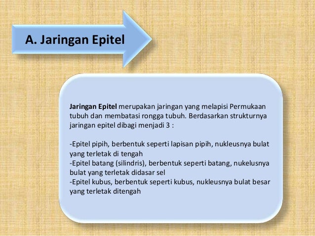 - 2. A. Jaringan Epitel Jaringan Epitel merupakan jaringan yang melapisi Permukaan tubuh dan membatasi rongga tubuh. Berdasarkan strukturnya jaringan epitel dibagi menjadi 3 : -Epitel pipih, berbentuk seperti lapisan pipih, nukleusnya bulat yang terletak di tengah -Epitel batang (silindris), berbentuk seperti batang, nukelusnya bulat yang terletak didasar sel -Epitel kubus, berbentuk seperti kubus, nukleusnya bulat besar yang terletak ditengah