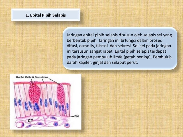- 3. 1. Epitel Pipih Selapis Jaringan epitel pipih selapis disusun oleh selapis sel yang berbentuk pipih. Jaringan ini brfungsi dalam proses difusi, osmosis, filtrasi, dan sekresi. Sel-sel pada jaringan ini tersusun sangat rapat. Epitel pipih selapis terdapat pada jaringan pembuluh limfe (getah bening), Pembuluh darah kapiler, ginjal dan selaput perut.