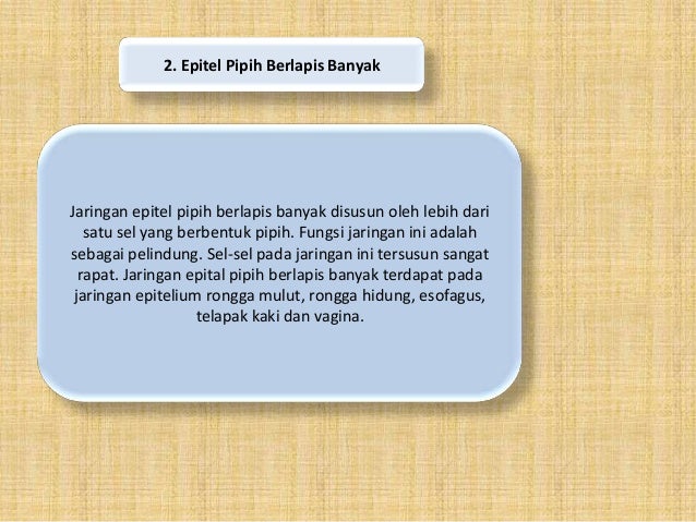 - 4. 2. Epitel Pipih Berlapis Banyak Jaringan epitel pipih berlapis banyak disusun oleh lebih dari satu sel yang berbentuk pipih. Fungsi jaringan ini adalah sebagai pelindung. Sel-sel pada jaringan ini tersusun sangat rapat. Jaringan epital pipih berlapis banyak terdapat pada jaringan epitelium rongga mulut, rongga hidung, esofagus, telapak kaki dan vagina.