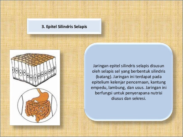 - 5. 3. Epitel Silindris Selapis Jaringan epitel silindris selapis disusun oleh selapis sel yang berbentuk silindris (batang). Jaringan ini terdapat pada epitelium kelenjar pencernaan, kantung empedu, lambung, dan usus. Jaringan ini berfungsi untuk penyerapana nutrisi diusus dan sekresi.