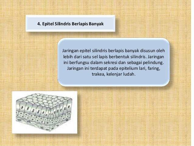 - 6. 4. Epitel Silindris Berlapis Banyak Jaringan epitel silindris berlapis banyak disusun oleh lebih dari satu sel lapis berbentuk silindris. Jaringan ini berfungsu dalam sekresi dan sebagai pelindung. Jaringan ini terdapat pada epitelium lari, faring, trakea, kelenjar ludah.