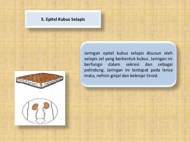 - 7. 5. Epitel Kubus Selapis Jaringan epitel kubus selapis disusun oleh selapis sel yang berbentuk kubus. Jaringan ini berfungsi dalam sekresi dan sebagai pelindung. Jaringan ini terdapat pada lensa mata, nefron ginjal dan kelenjar tiroid.