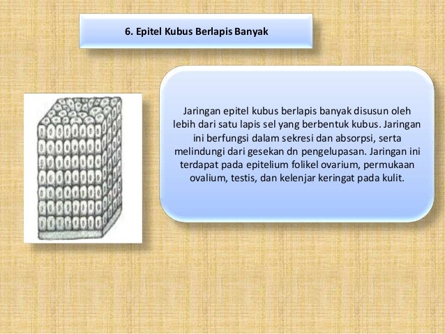 - 8. 6. Epitel Kubus Berlapis Banyak Jaringan epitel kubus berlapis banyak disusun oleh lebih dari satu lapis sel yang berbentuk kubus. Jaringan ini berfungsi dalam sekresi dan absorpsi, serta melindungi dari gesekan dn pengelupasan. Jaringan ini terdapat pada epitelium folikel ovarium, permukaan ovalium, testis, dan kelenjar keringat pada kulit.